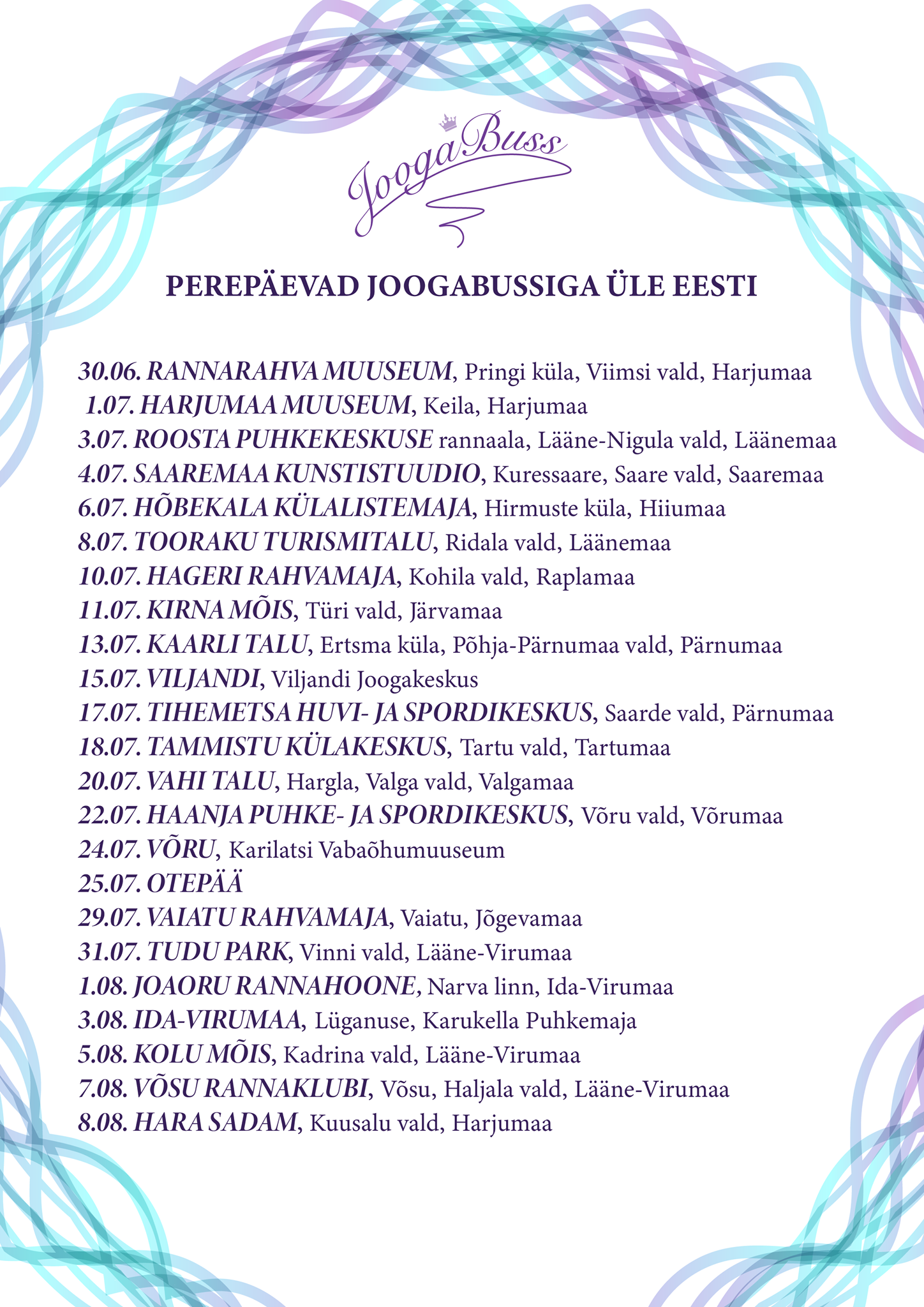 Joogabussi perepäevad toimuvad 23 kohas üle Eesti ja sellega luuakse algus iga-aastasele traditsioonile. Joogabussi suvine teekond algab 30. juunil Viimsis ning lõppeb 8. augustil Kuusalus.