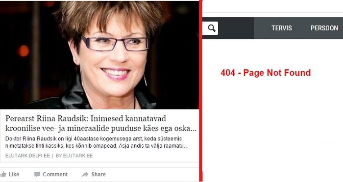 raudsikEile, 10. detsembri hommikul ilmus Delfi küpsematele lugejatele mõeldud teemaportaalis Elutark intervjuu perearst Riina Raudsikuga, kuid mõne tunni möödudes seisis samal lehel tekst “Page Not Found”. Üle väga pika aja antud avameelses intervjuus vastas Raudsik lisaks tervisest ja haiguste põhjusest ka MMS-iga seotud meediasõja teemalistele küsimustele, sest justnimelt tema oli see arst, kes avalikult n-ö risti löödi selle eest, et ta tollesse Facebooki gruppi kuulus, hoolimata sellest, et ta oli teinud avalduse, et pole seda ainet ei kasutanud ega ka mitte oma patsientidele soovitanud. Saatsime järelpärimise artikli eemaldamise kohta Delfi peatoimetaja Urmo Soonvaldile. Seni, kuni vastust ootame, saab aga igaüks ise artiklit lugeda ja otsustada, kas see ikkagi on tsensuuri vääriline.