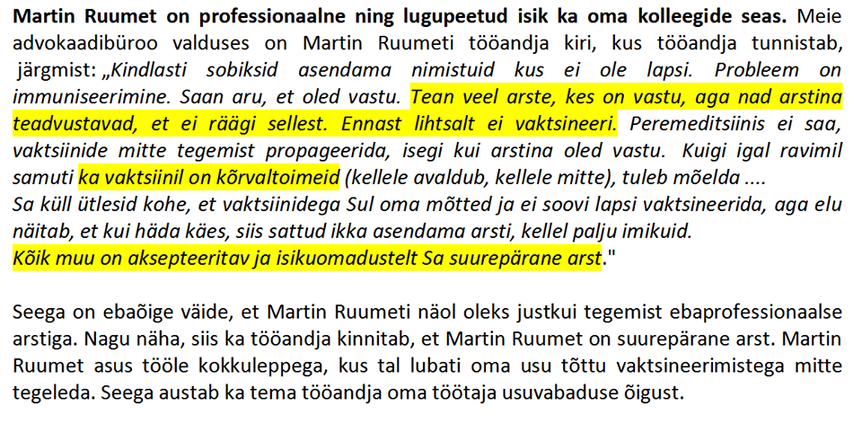 “Peavoolumeedia on algatanud kampaania arsti vastu, kes teeb oma tööd kohusetundlikult ja keda tööandjad on kiitnud kui head arsti. Teda eristab teistest arstidest vaid see, et on palunud oma tööandjal teda välja jätta vaktsiinidega tegelemisest, oma usuliste vaadete tõttu. Nüüd on algatatud nõiajaht – täna tuleb “Radaris” ja homme “Pealtnägijas” laimusaade,” kirjutab oma FB lehel Vaktsineerimiskahjustusega Laste Vanemate Ühing (VLVÜ). Asi on läinud nii tõsiseks, et mängu on tulnud ka advokaat, kes saatis Kanal2-le ja ERR-ile vastulause, mida teiega nüüd jagame.
