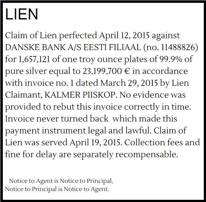 “Lien” on rahvusvaheline termin, mis tähendab tsiviilaresti. Samasuguseid areste on peale pandud ka Swedbankile ja Nordeale ning need teated on ilmunud ka avalikus meedias, ajalehes Kuldne Börs. Sellise tsiviilaresti teate kleepisin ma DanskeBank AS Eesti Filiaali peakorteri uksele Tallinnas Narva maanteel 19. aprillil 2015. Selles oma tehingus olen ise kohtutäituri rollis. Õigus tsiviilarestiks tekib siis, kui märgitud kuupäevaks arve tasutud ei ole.