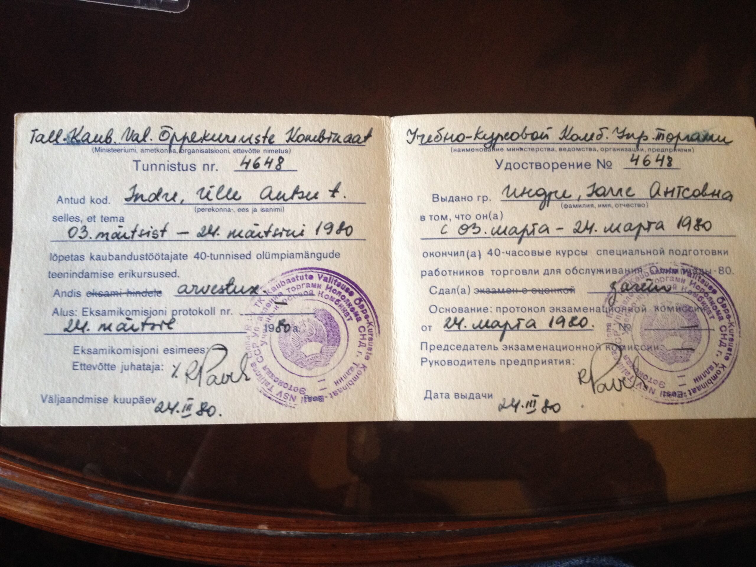 Tunnistus aastast 1980, kui Ülle pidi Moskva OM-i tarvis eraldi teenindajate koolituse läbima IMG_4379