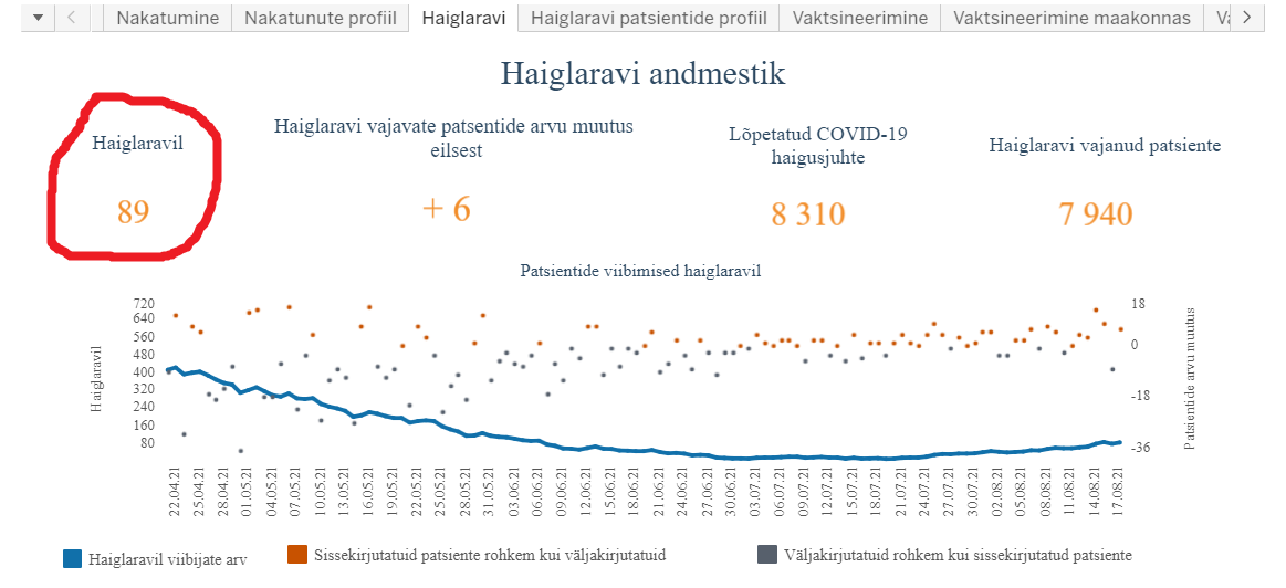 Ükskõik, mida keegi arvab PCR-testidest või üleüldse viirustest ja nende tüvedest, siis tänase (18.08.2021) seisuga on Terviseameti andmete põhjal haiglaravil 89 inimest.