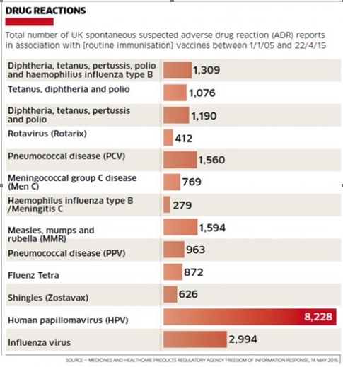 Ülalolevas tabelis on Suurbritannia 10 aasta andmed kõrvalmõjude teatiste kohta perioodist 01.01.2005 kuni 22.04.2015. Kuna Suurbritannias võeti HPV vaktsiin immuniseerimiskavva septembris 2008, siis on HPV vaktsiini kõrvalmõjude andmed antud tabelis 3 aastat ja 8 kuud lühema perioodi kohta kui teistel vaktsiinidel. Erinevus kõrvalmõjude esinemissageduse osas on hirmuäratav. Ametlikel andmetel on 33% esitatud teatistest HPV vaktsiini osas tõsised.