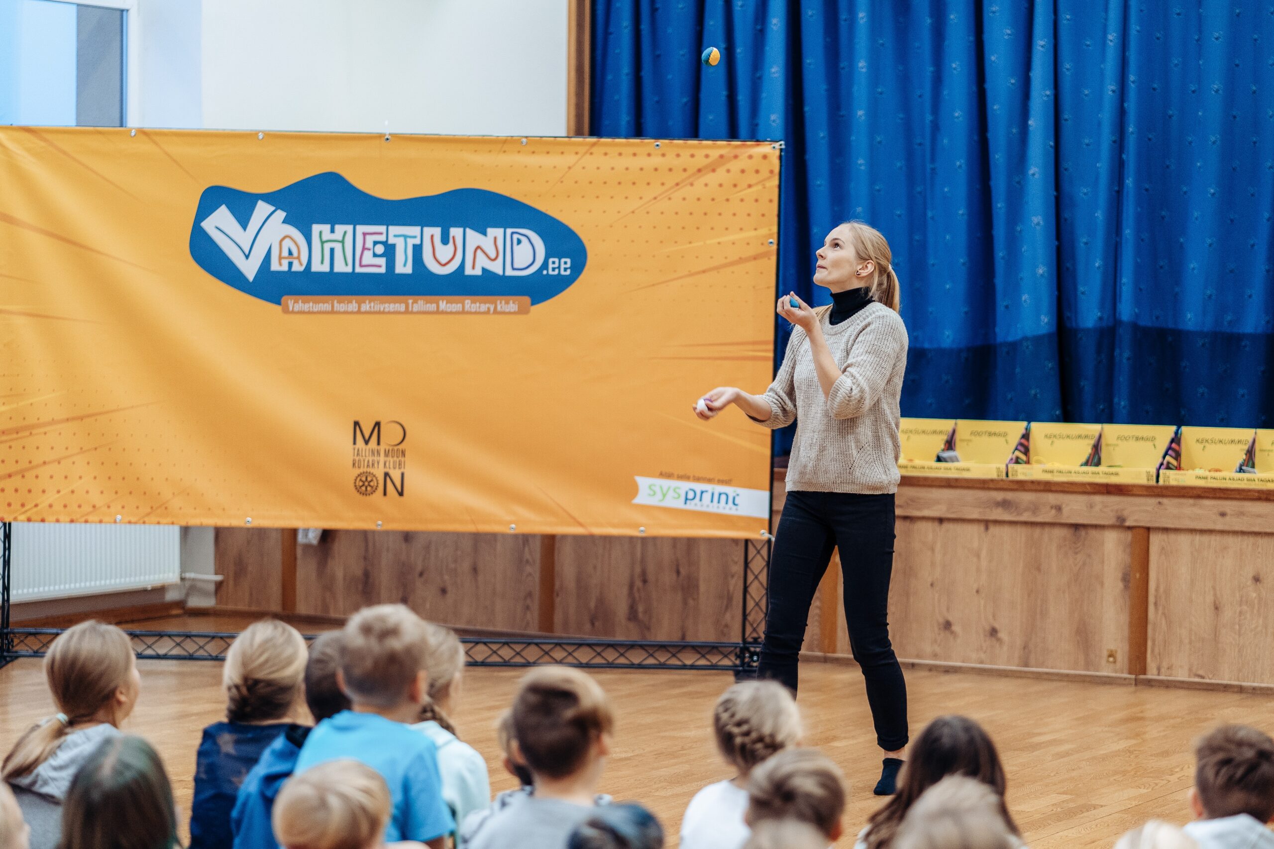 Tallinn Moon Rotary klubi vahetund.ee projekti eesmärk on tuua lastele vahetundidesse rohkem omavahelist suhtlemist ja selle läbi märkamist, et kuidas füüsiliselt oma keha kasutada. Tehes nendega selliseid väikseid katseid, et mida nad arvavad kummikeksust, siis pidime tõdema, et nad tõesti ei saagi aru, kuidas näiteks kolmandal tasemel jalg üle keksukummi saada. Nad küsisid, et kui ma hüppan, siis kuidas ma jala üle kummi saan. See ongi meie eesmärk, et luua nende mõttemaailmadesse seda kohta, et kuidas selline tegevus käib, arendada füüsist, selle tulemusena tekitada neisse rohkelt elurõõmu ja rohkem sellist elus olemist!