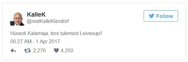 Teatame, et eilsel erakorralisel Tallinna Linnavalitsuse istungil võeti ühehäälselt vastu otsus muuta Kalamaja piirkonna nimi ümber Leivasupiks. Kalamajale uue nime leidmine on olnud meil päevakorras juba mitu kuud, sest teatavasti üha rohkem inimesi on hakanud taimetoitlasteks ning Tallinna Linnavalitsus on alati avatud innovatiivsusele ja muutustele. Seega kuulutasime aasta algul välja Kalamajale uue nime leidmise konkursi, sest olgem ausad, kala ju ei ela majas vaid ikkagi vees. Uue nime tingimuseks oli, et nimi peab olema hea kõlaga, kergelt nostalgiline ja ei tohiks riivata kellegi tõekspidamisi. Konkursile laekus üle 200 erineva nime variandi, nende seas mitmeid potensiaalseid hitt nimesid, kuid viimases voorus tegi Leivasupi kõigile ära ning osutuski võitjaks. Leiame, et Leivasupi on ideaalne ja vääriline nimi Tallinna ühele vanimale linnaosale.