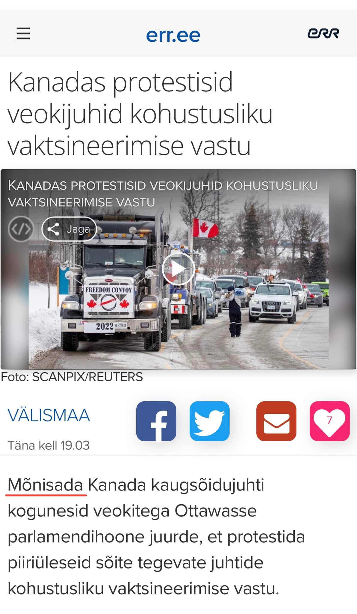 Kanada massiprotesti kajastamist peavoolumeedias on olnud huvitav jälgida. Parima “pirni” pani eile ERR, kui “Aktuaalses kaameras” raporteeriti, et kogunes mõnisada veoautot. Sama kirjutati ka ERR-i uudisteportaalis, mis hiljem (CBC eeskujul) parandati tuhandeteks. Millegi pärast ei suudeta loobuda vanast uudisteagentuuri valmis treitud materjali kopeerimise harjumusest, isegi, kui internetis on vabalt saadavad videod ja muu info, mis palju tõelähedasemaid numbreid kajastavad.