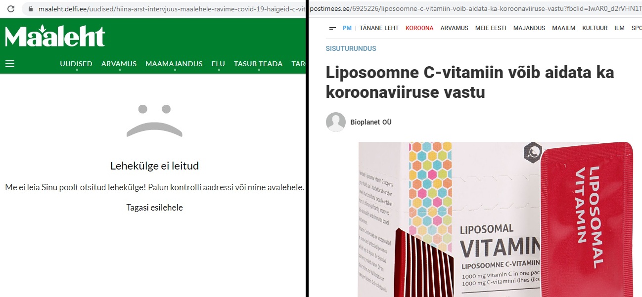 Ometi ilmus Postimehe veergudel 19. märtsil sisuturundusartikkel “Liposoomne C-vitamiin võib aidata ka koroonaviiruse vastu“, kus seisab must-valgel: “Kliiniliste uuringutega on tõestatud, et viirushaiguste puhul tugevdab C-vitamiin immuunsüsteemi ning lühendab haiguse kulgu ja haige olemise aega ka juba haigestumise korral”