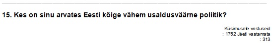 Valik teisi vastuseid: Käib alles lasteaias; Siim Nestor; Poliitik ei saa kunagi olla usaldusväärne – kõike paremal juhul on ta kas naiivne või rumal; See on nüüd küll suur naeru koht; Mis on parim halvaks läinud supi sees – kas porgand, kartul või kaalikas?; Kõige usaldusväärsem Eesti poliitik on poliitikast lahkumisavalduse esitanud poliitik; Kõik on petised; Hahahahahahaaaa; Polegi, nad kõik on head näitlejad; Usaldusväärsed inimesed ei tegele poliitikaga.