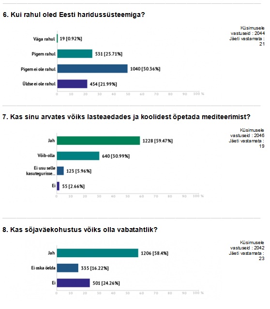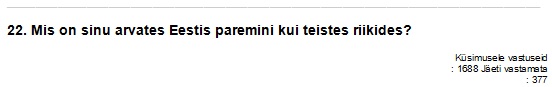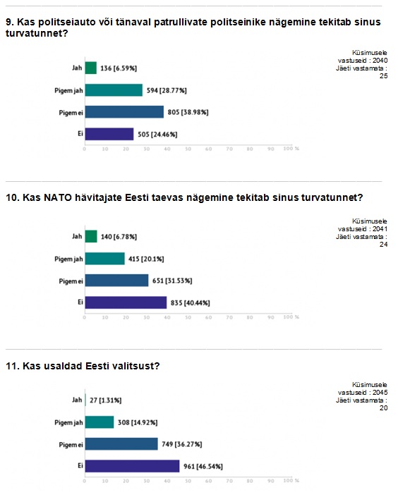 Sellel küsimusel valikvastused puudusid, kõige enam mainitud vastused: majandus; korruptsioon; valitsus; Tallinna linnavalitsus; bürokraatia; poliitikud ei vastuta oma tegude eest; valimisseadus; ebavõrdsus ühiskonnas; FIE-de ja väike-ettevõtjate maksukoormus; väike palk, vaesus; kõrged maksud; pidev hinnatõus; negatiivsed ja kadedad inimesed; ignorantsus; meedia; reaalsete probleemide asemel tegeletakse pseudoprobleemidega; sallivus; koolisüsteem, laste ülesannetega ülekoormamine.
