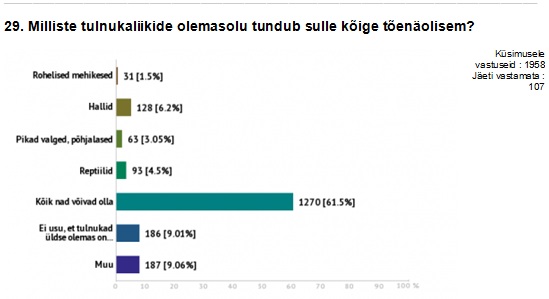 Veel vastuseid: Tulnukad inimeste kehas, hübriidid; Kehatud, meist erinevad energiad, paralleeluniversumis elavad olendid; Kui nad kusagil olemas on, siis mina pole huvitatud nende välimuse teada saamisest; Tulnukad oleme me ise tulevikust.