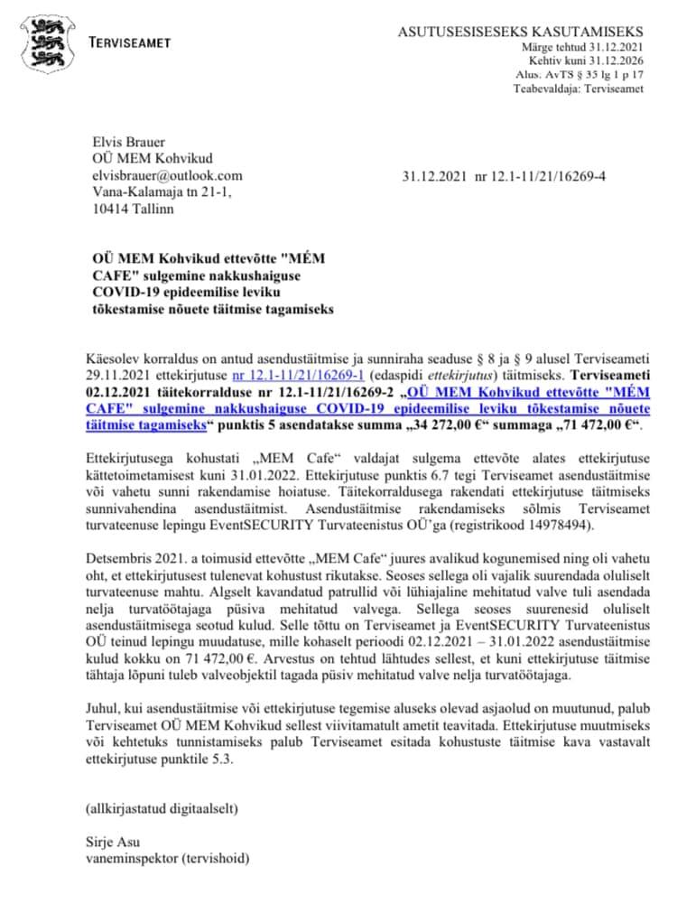 Nimelt teatas ameti eeskujulik koroonavõitleja 2021. aasta viimsel päeval, et ameti ja turvameeste ennastsalgav töö muutus ligi 35 000 euro võrra kallimaks, ehk siis kohvikult püütakse senise 34 272 euro asemel sisse nõuda 71 472 eurot.