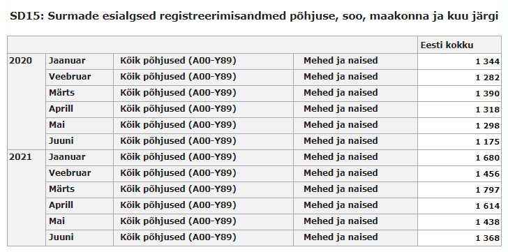 Kui 2020 jaanuarist juunini oli Eestis 7807 surma, siis 2021. aasta jaanuarist juunini juba 9353 surma,