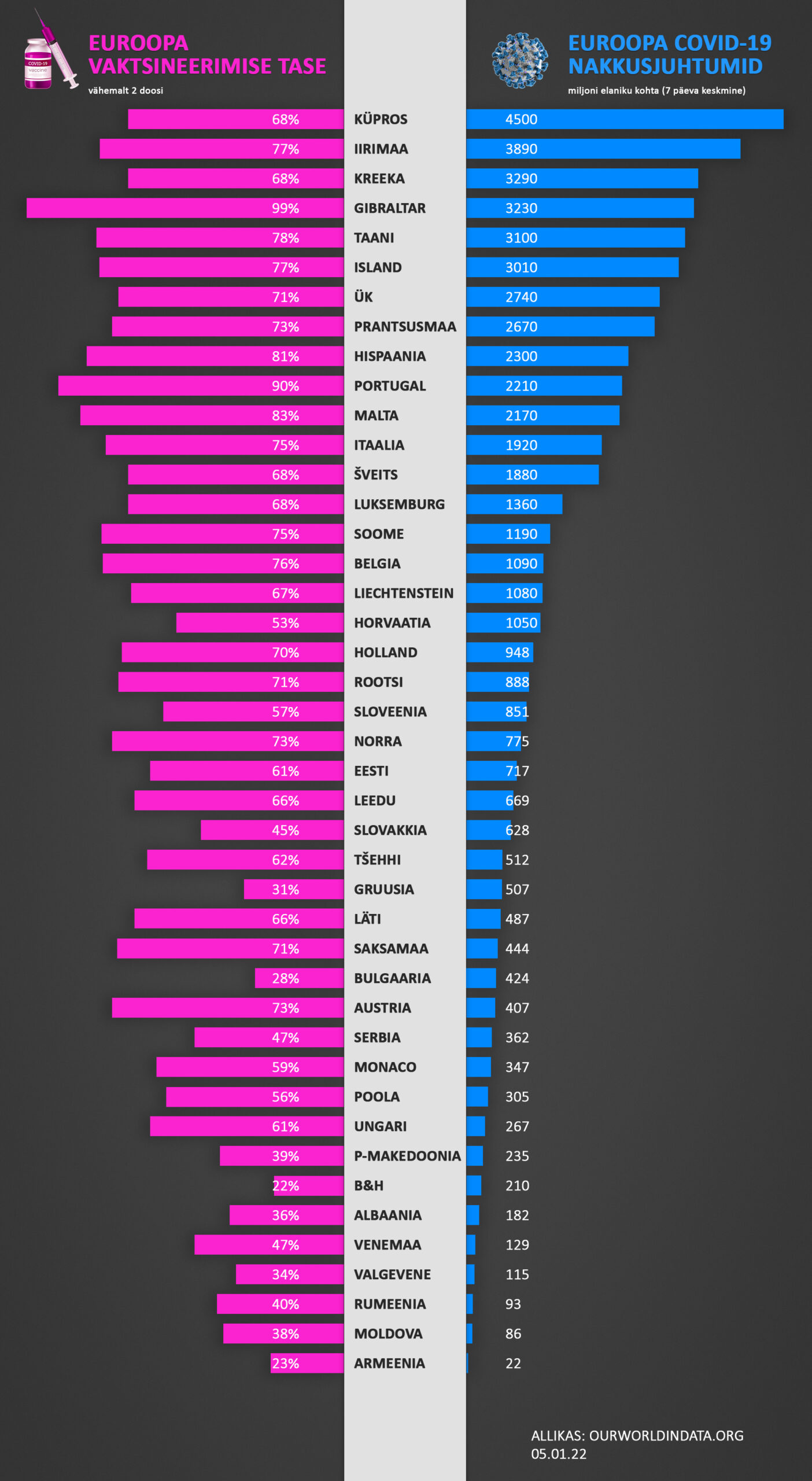 Kuigi iga nädal toob üle maailma aina enam uusi vaktsineerituid, kasvab sama hooga ka nakatunute arv. Muidugi ei saa teha sellest mingit lõplikku järeldust, kuna igas riigis on testimisnõuded erinevad, kuid küsimusi tekitavad need näitajad igal juhul. Alloleva tabeli koostamiseks on kasutatud Oxfordi ülikooli andmebaasi Our World in Data.
