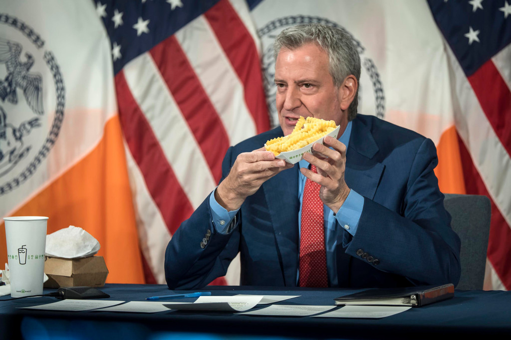 De Blasio, kes kasutas söömiseks käsi, erinevalt sellest kurikuulsast söömaajast, kus ta sõi söögiriistadega pitsat, propageeris Shake Shacki uut pakkumist kinkida tasuta friikartuleid klientidele, kes näitavad oma vaktsineerimiskaarti järgmise kuu jooksul suvalises kohas.