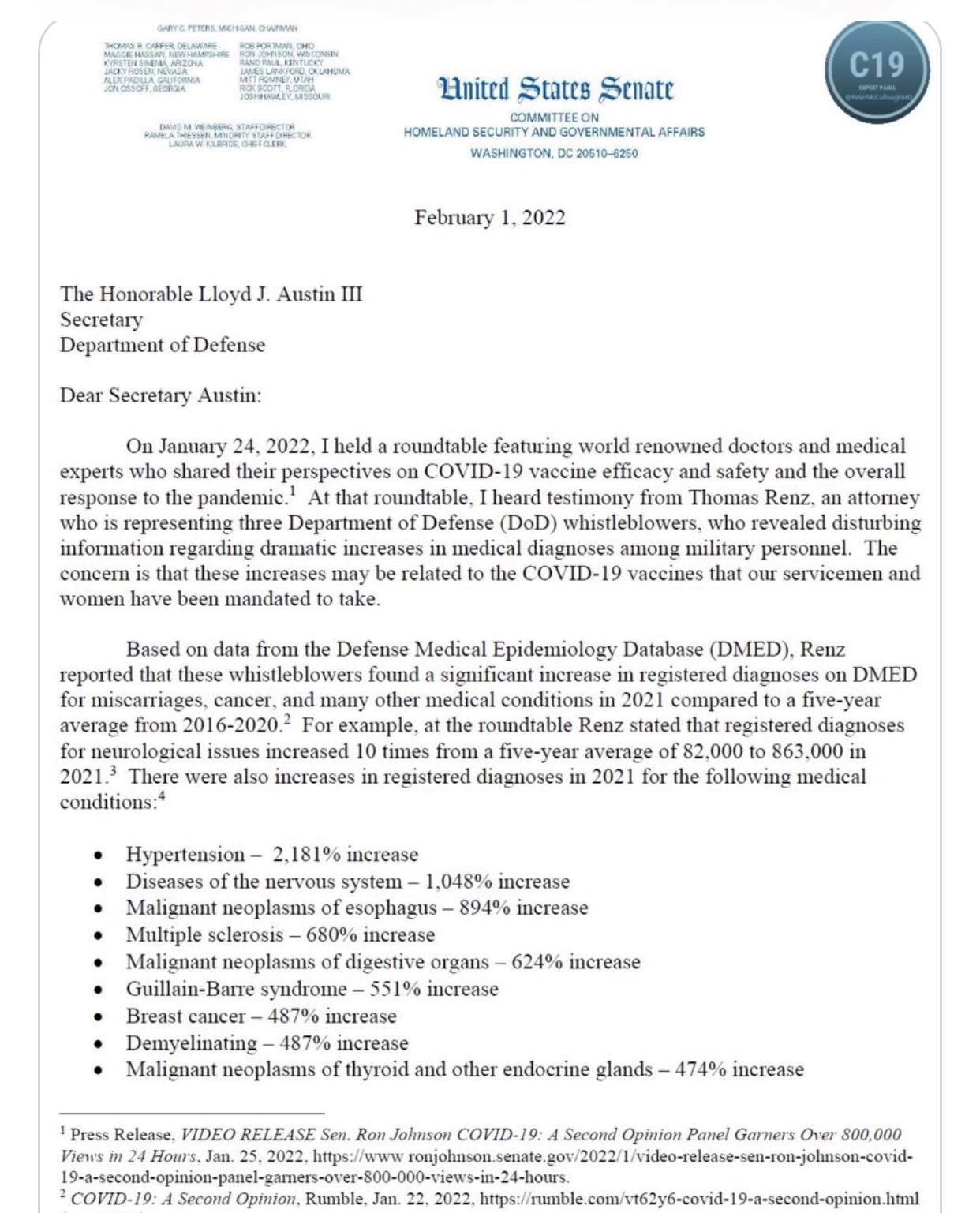 Peale ekspertide paneeli kuulamist ja DoD (Department of Defence) vilepuhujate tõendusmaterjalidega tutvumist saatis senaator Ron Johnson USA kaitseminister Lloyd Austinile kirja, kus ta oma muret väljendab.