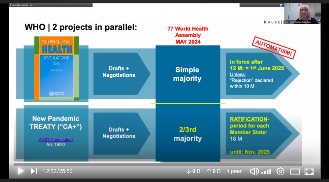 20. novembril 2023 korraldatud MKR-i WHO õhtu alguses esitas meditsiinispetsialist Rauli Mäkelä illustreeriva pildi kahest rahvusvahelisest lepingust, rahvusvahelisest tervisemäärusest (IHR) ja pandeemialeppest, mida WHO kiiresti edasi lükkab, advokaat Philipp Kruse poolt, kes tunneb WHO võimupüüdlusi. IHRi ettevalmistustööd propageeritakse pimeduses, kuid uuest pandeemialepingust räägitakse avatumalt.