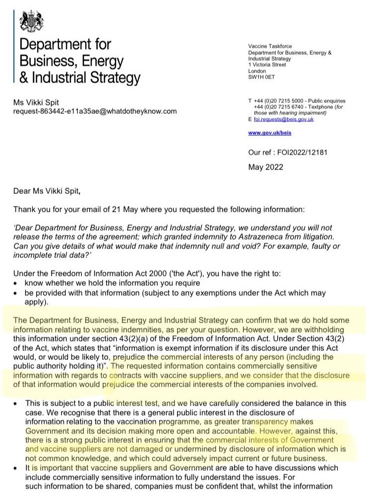 Suurbritannias on aset leidnud pretsedent, kus valitsus tunnistab, et vaktsiinitootja kaubandushuvid on piisavaks põhjuseks, miks teda vabastada vastutusest kohtuvaidlustes. Vikki Spiti partner suri pärast AstraZeneca vaktsiini, mille peale naine tegi taebavabaduse seadusele tuginedes infopäringu, et uurida, millistel tingimustel on vaktsiinitootja vabastatud vastutusest kohtuvaidlustes? Selle peale vastati talle, et AstraZeneca kaubandushuvid kaaluvad üles päringu esitanud kodanikule info väljastamise kohustuse.