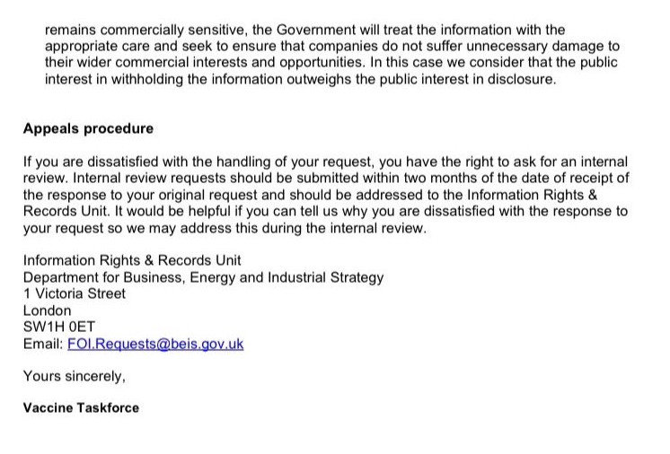 Soovitud informatsioon sisaldab äriliselt tundlikku informatsiooni, mis on seotud vaktsiinitootjate lepingutega, ja me leiame, et selle teabe avaldamine kahjustaks kaasatud ettevõtete ärihuve.