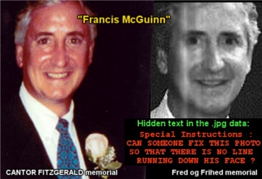 Analüüsides erinevaid portreesid, mida 9/11 memoriaalidel kasutatakse, võime tihtilugu märgata, et mitmeid “ohvreid” on kuvatud kahel äärmiselt sarnasel fotol. Kas me peaksime arvama, et nende “ohvrite” omaksed kõik jagasid peaaegu et kloonitud portreesid oma pereliikmetest? Kui suur on tõenäosus, et ühte inimest saab kahel suvalisel hetkel jäädvustada praktiliselt samas valguses, sama ilmega ja sama nurga alt? Siin on 45 sellist portree-paari. Piisab kui ainult vaadata neid 90 fotot, kommentaarid on ebavajalikud.
