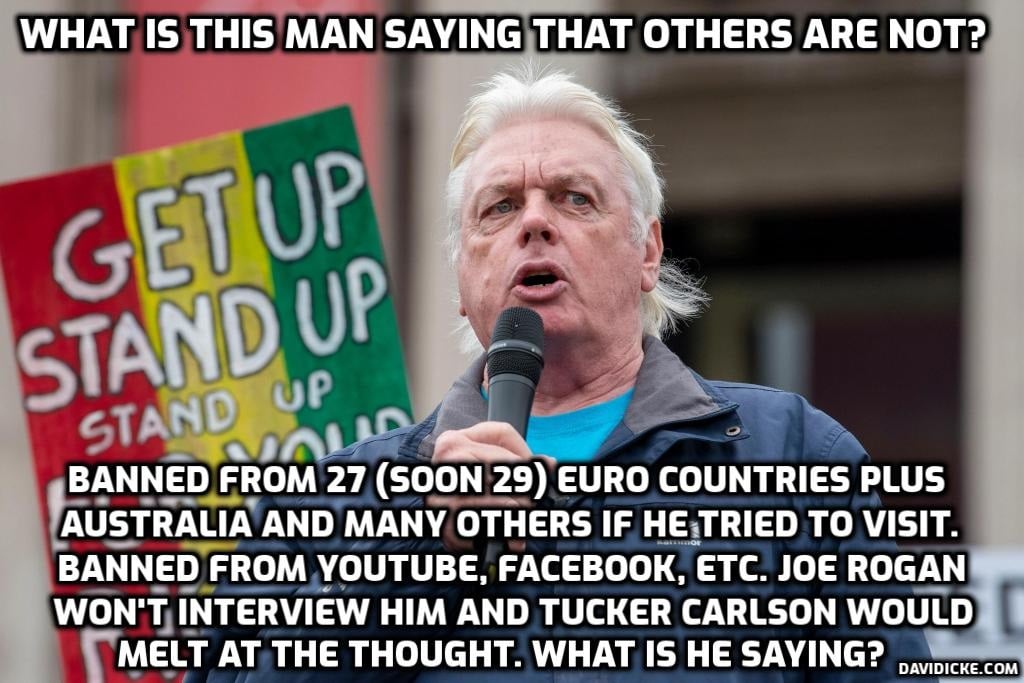 Briti uuriija David Icke on viimased 34 aastat paljastanud erinevaid vandenõusid, millest enamik on tänaseks osutunud tõeks. Icke’il on 27-sse (peagi 29-sse) Euroopa riiki sisenemise keeld, lisaks Austraaliasse sisenemise keeld jmt. Ta on tühistatud Facebookist, Youtube’ist, Instagramist jne. Joe Rogan keeldub teda intervjueerimast, ka Carlson Tucker pole sellest samuti huvitatud. Miks?
