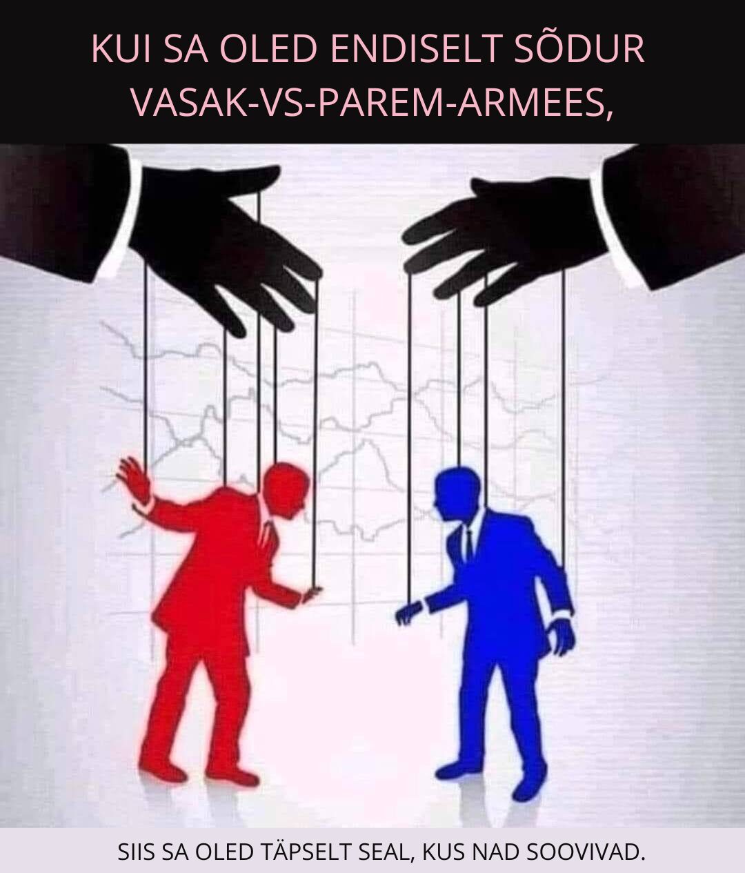 “Kui valimised midagi muudaks, oleks need ammu ära keelatud” on üks teine äärmiselt tuntud vandenõukultuuri mõttekäik, aga sellegipoolest usub pea pool elanikkonnast, et kui Trump pääseks võimule, saaksime oma mured ja probleemid lahendatud. Täpselt sama usub ühe oma lemmikerakonna kohta ka väga suur hulk eestlasi.
