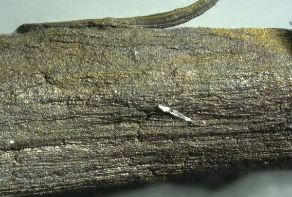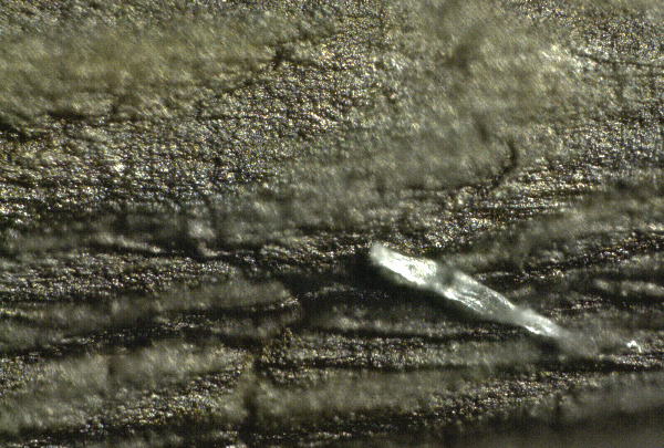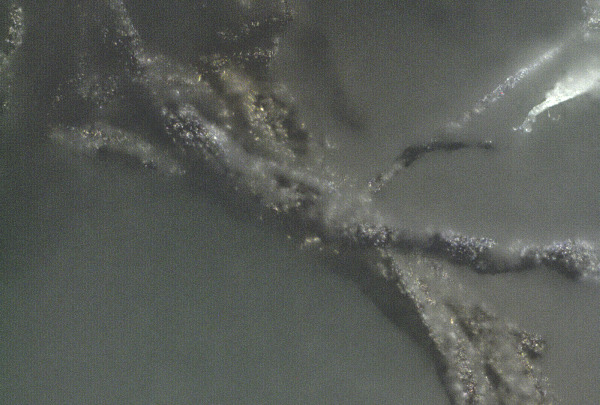 Kristallitaolised struktuurid on kinnitatud verehüübe kooretaolise struktuuri külge. Pidage meeles, et see tromb on värvitud violetse peitsiga, mis annab selle tumelilla värvi.