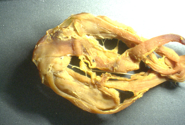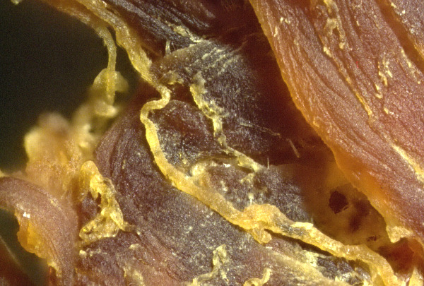 Järgnev proov värviti joodiga, seejärel pesti etüülalkoholiga. Kui te ei saanud aru, kust see pärineb, võite arvata, et see on veiseliha või kanatükk. Tegelikkuses on see kõik veresoonte või arterite seest leitud trombkude.
