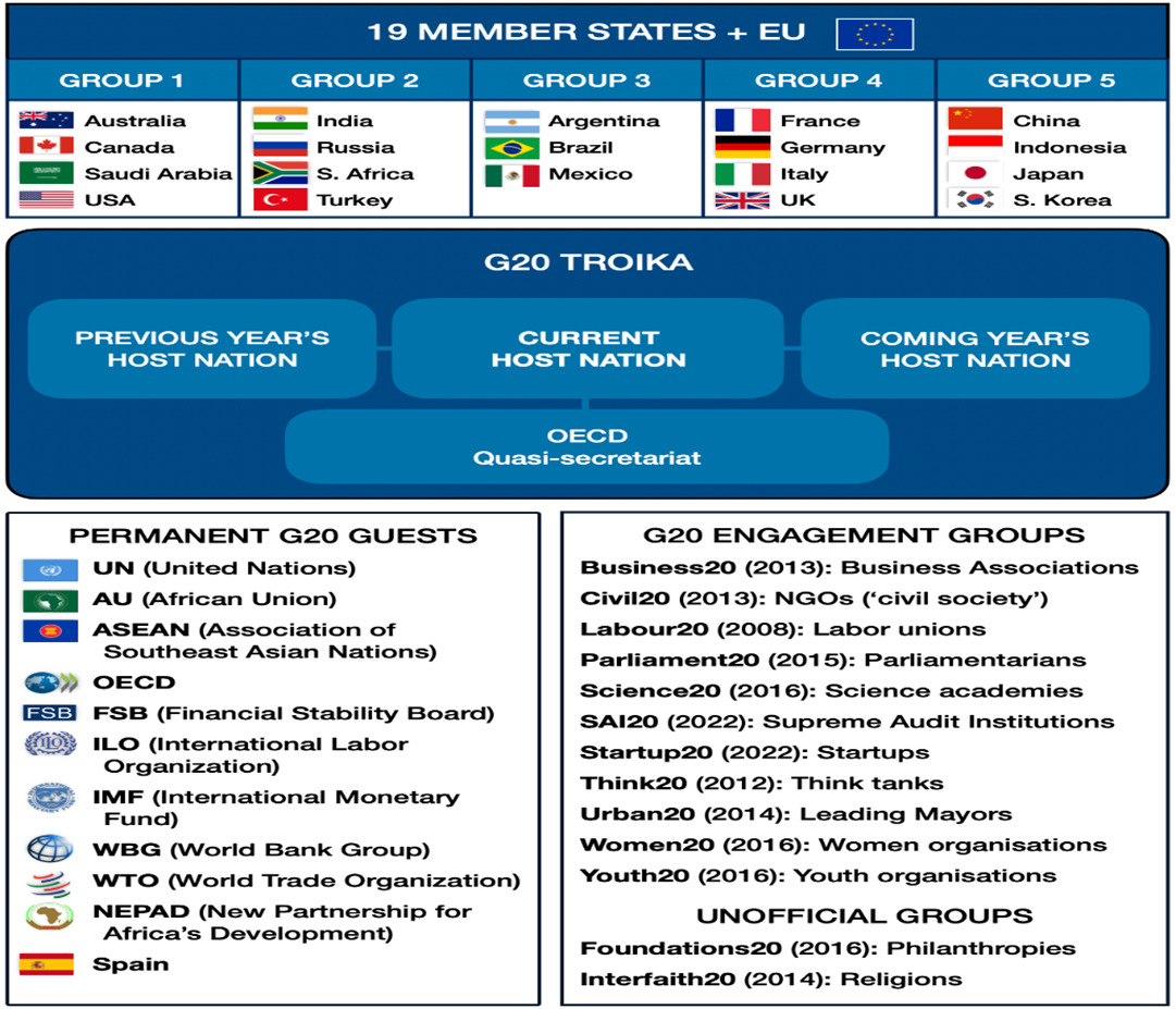 Venemaa NLKP peasekretärina Eestis 1987. aasta veebruaris visiidil käinud Mihhail Gorbatšov nimetas seda kunagi „globaalseks poliitbürooks“. Rühm koosneb 19 liikmesriigist, lisaks Euroopa Liidust (EL) ja hiljuti liikmeks võetud Aafrika Liidust (AL).