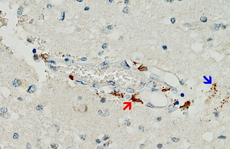 Vaktsiini ogavalgu ladestumine aju otsmikusagaras. Foto: Michael Mörz / MDPI (SARS-CoV-2 ogavalgu tuvastamine ajukoes vaktsiini poolt indutseeritud entsefaliidiga surnud patsiendilt immunohistokeemia abil. Pruuni pigmendi ladestumine näitab ogavalgu olemasolu väikese veresoone seinas (punane nool) ja ümbritseva ajukoe mitmes gliiarakus (sinine nool).)