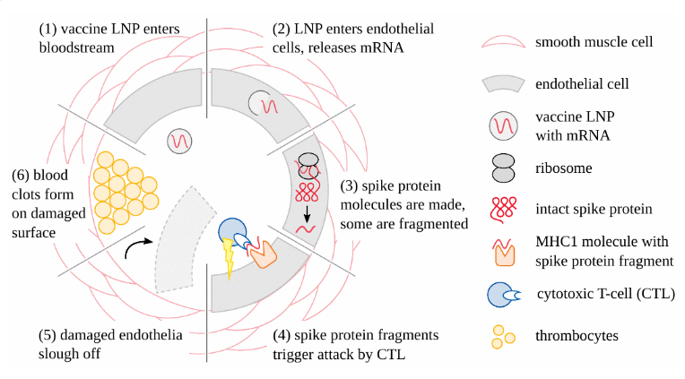 Joonis 1: Kuidas COVID-19 mRNA vaktsiinid kahjustavad veresooni ja põhjustavad vere hüübimist. Pärast vaktsiini lipiidide nanoosakeste sisenemist ringlusse võtavad endoteelirakud need üle ja mRNA vabaneb. Seejärel ekspresseeritakse ogavalk; mõned molekulid on killustunud ja esitatud rakupinnal spetsiaalse kandjavalgu (MHC1) poolt. See põhjustab tsütotoksiliste T-rakkude rünnaku endoteelirakkudele. Hävitatud endoteelirakud lagunevad, hõlbustades vaktsiiniosakeste lekkimist külgnevatesse kudedesse. See avab verele ka veresoone seina sügavamad kihid, mis käivitab trombotsüütide agregatsiooni ja vere hüübimise.