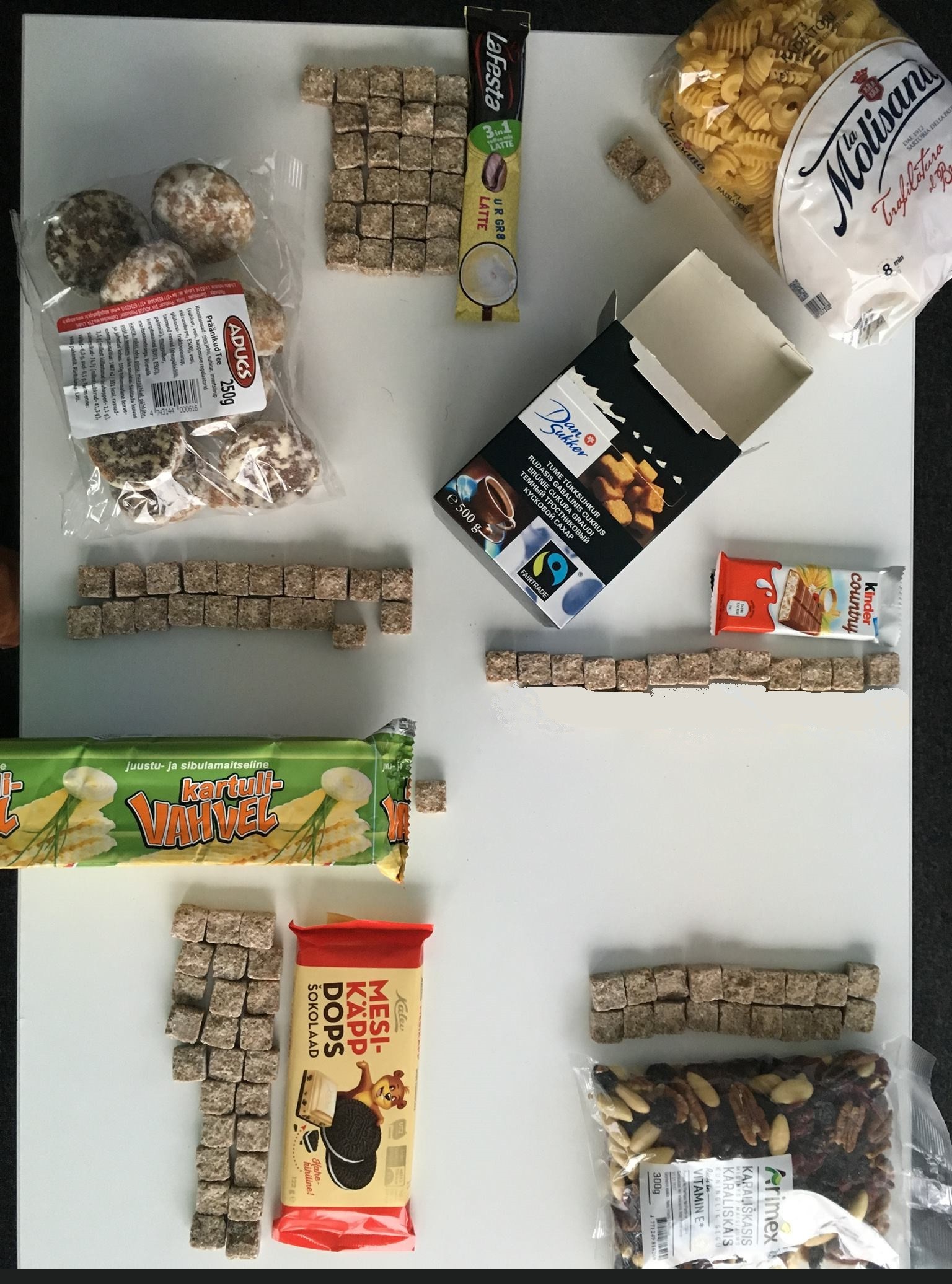 Toitumis- ja elustiilinõustaja Terje Mander postitas pühapäeval oma Facebooki seinale alloleva pildi ja kirjutas juurde: “Tegime väikse pühapäevase matemaatikatunni! Arvutasime toodete suhkrusisalduse 100g kohta ja lõime visuaalse reaalsuse, suhkrukuubiku kogusena kõrvale! Teadvustada ikka hea! Suhkur segatuna rasvaga tekitab olukorra, kus aju ei fikseeri koguseid! Šokolaadid, kreemikoogid!”