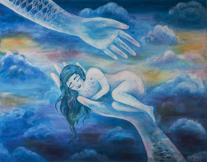 “Selle maali kandev mõte sündis imelise Riita massaažimaagia käigus kõrgustesse liueldes. Mul tekkis tunne, et ma olen väga tilluke ja rahulolev. Mind hoidsid maa ja taeva vahel kellegi suure ja hoolitseva peod. Tundsin tuult oma kehal ja aimasin kuskil kaugel all laiuvat sügavikku. Usaldasin end selle suure kaitsevaimu hoole alla ning tekkinud pingevabas vaikuses tundsin ära paiga mu mõtetes, kus saan puhata, end ravida ja vanadele valudele andeks anda.” – kunstnik Maari Soekov